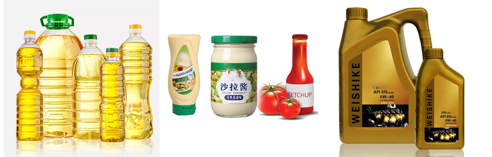 Huile comestible (Sésame, olive, arachide / mélange .etc) Ketchup, mayonnaise, sauce chili, etc. Huile lubrifiante + solvants spéciaux .etc